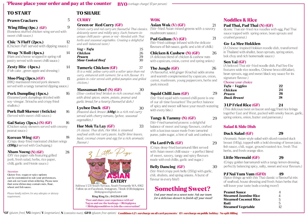 Welcome to Three Little Pigs (3 Little Pigs), a vibrant café located at 231 South Terrace, South Fremantle. Here, you’ll embark on a culinary adventure that fuses the rich flavors of Australian, Thai, Japanese, and Korean cuisine. The menu is an enticing blend, offering dishes such as GoLa Mee Hokkien and 3 Lp Fried Rice for noodle enthusiasts. Families will appreciate the Little Peeps section, featuring delightful options like the Baby PigChino and Ham Cheese Toastie.